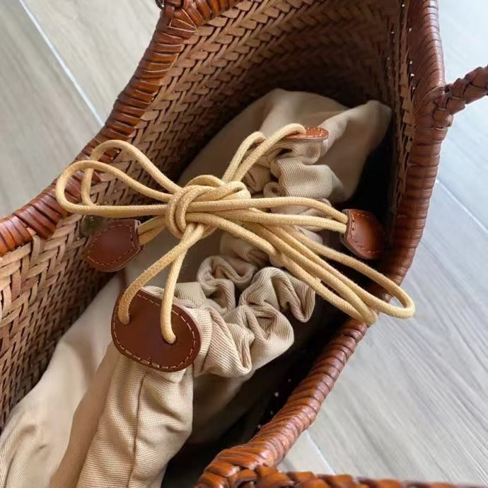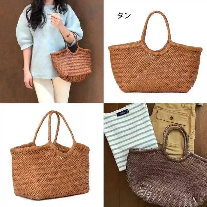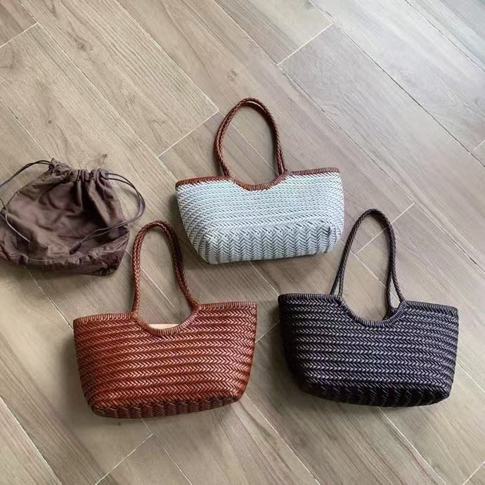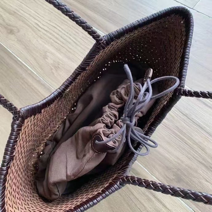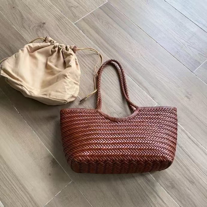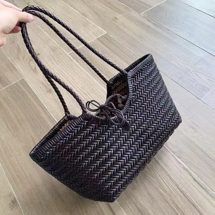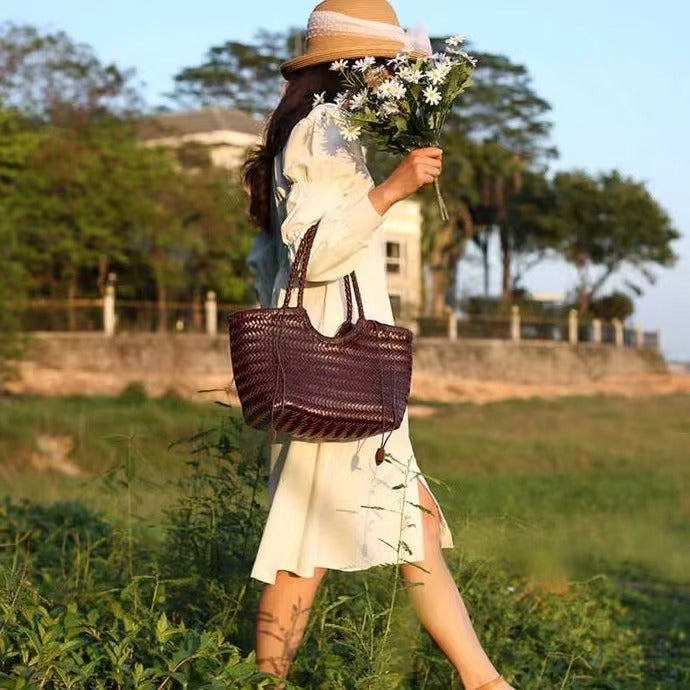 2025 Brown French Handmade Woven Handbag Women's New Genuine Leather Vegetable Basket Large Capacity Retro Shopping Bag