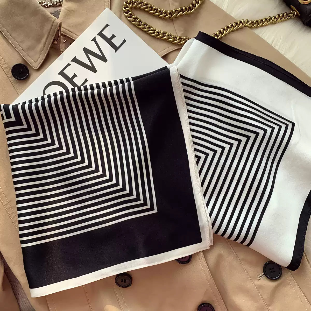 2025 Classic Black White Mulberry Silk Scarf Korean Versatile Striped Thin Decorative Small Square Scarf