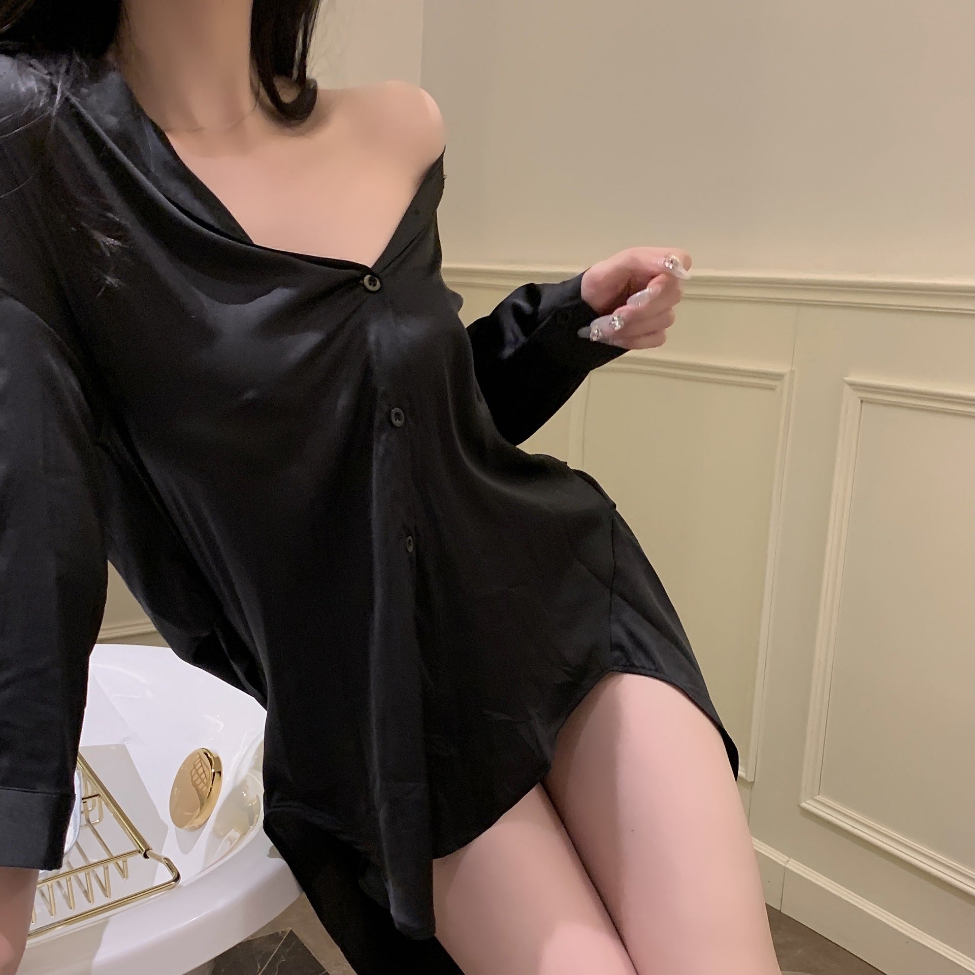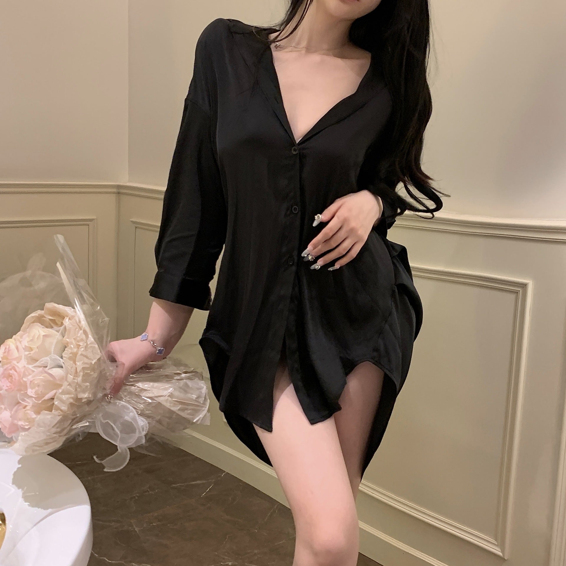 Black Plus Size Boyfriend Style Shirt Sexy Pajamas Women‘s V-neck Ice Silk Pure Style Nightdress Suit