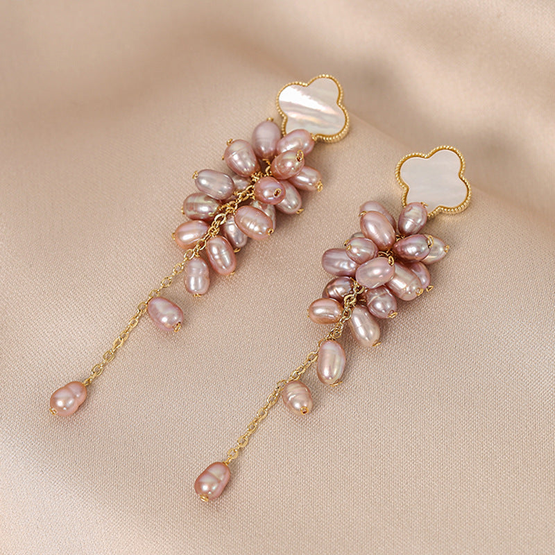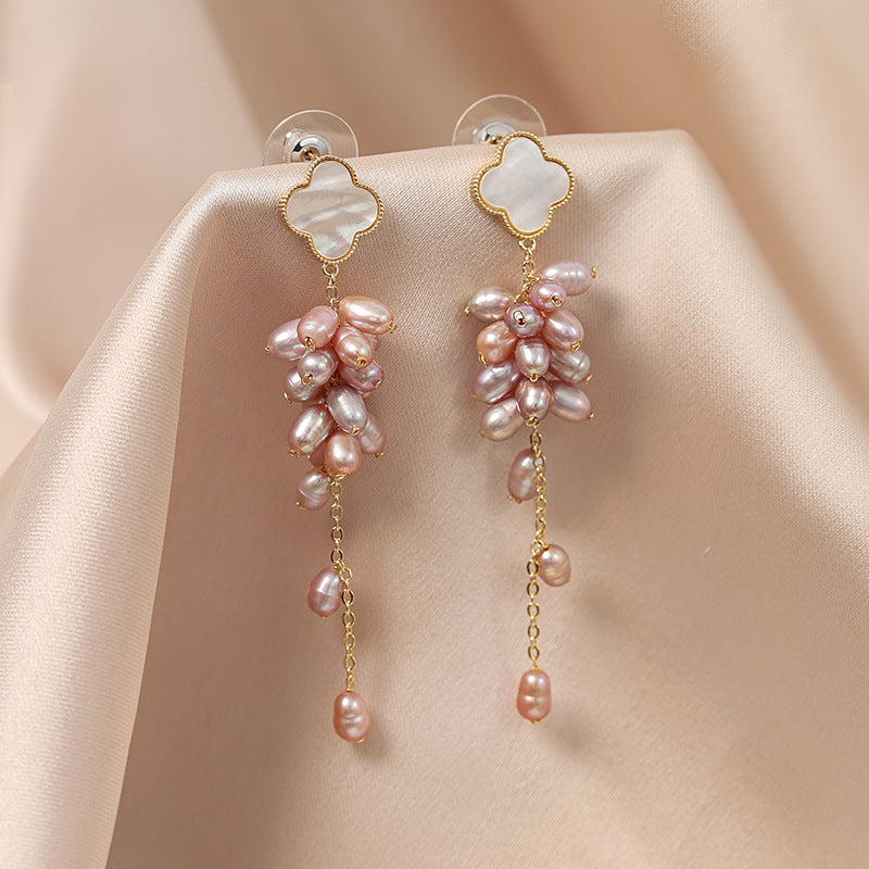 Four-leaf Flower 925 Silver Needle Freshwater Pearl Grass Long Earrings Women‘s Slimming Floral Personality Fashion Eardrop