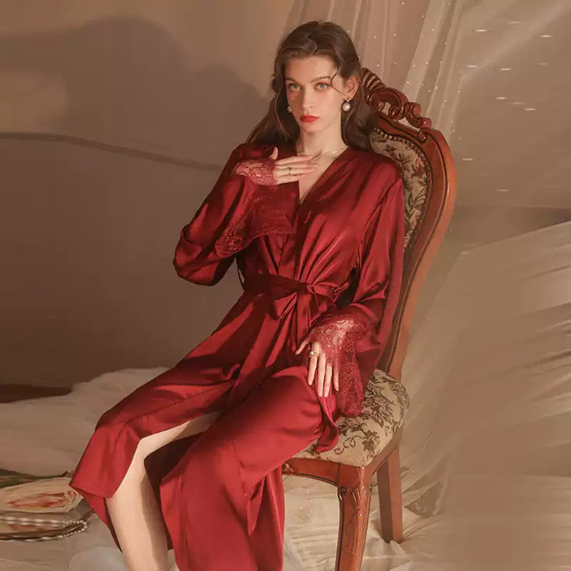 Maroon Ice Silk Sweet Sexy Pajamas Women's Long-sleeved Thin Red Long Bathrobe Sleepwear
