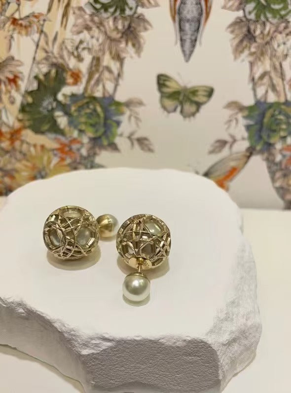 Introducing the new Tribales hollow round ball CD pearl double ball earrings. Featuring a classic plaid-cut design paired with pearl elements, these earrings exude an elegant yet slightly edgy vibe, reminiscent of a wealthy heiress.