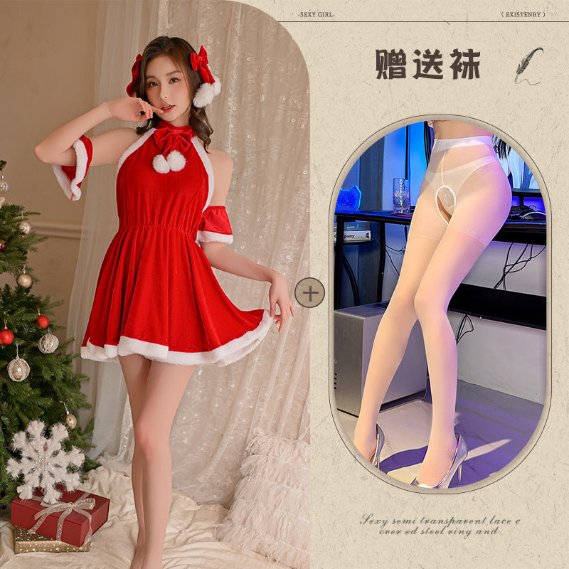 New Year Hottie Sexy Lingerie Christmas Playful Cute Plush Backless Red Dresses Uniform Set