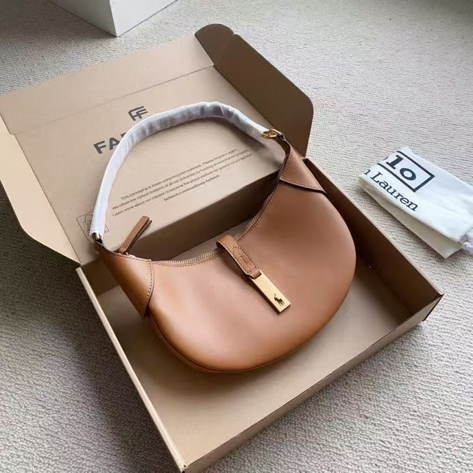 Niche Light Brown Metal Logo Lock Saddle One-shoulder Underarm Commuter Bag Women's Leather Handbag Crescent Cowhide Bag