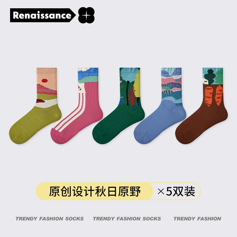 Original Design New Long Art Oil Painting Pattern Ins Trendy Style Middle Tube Cotton Socks