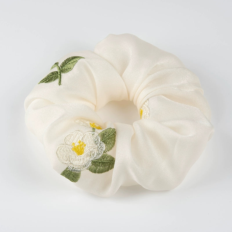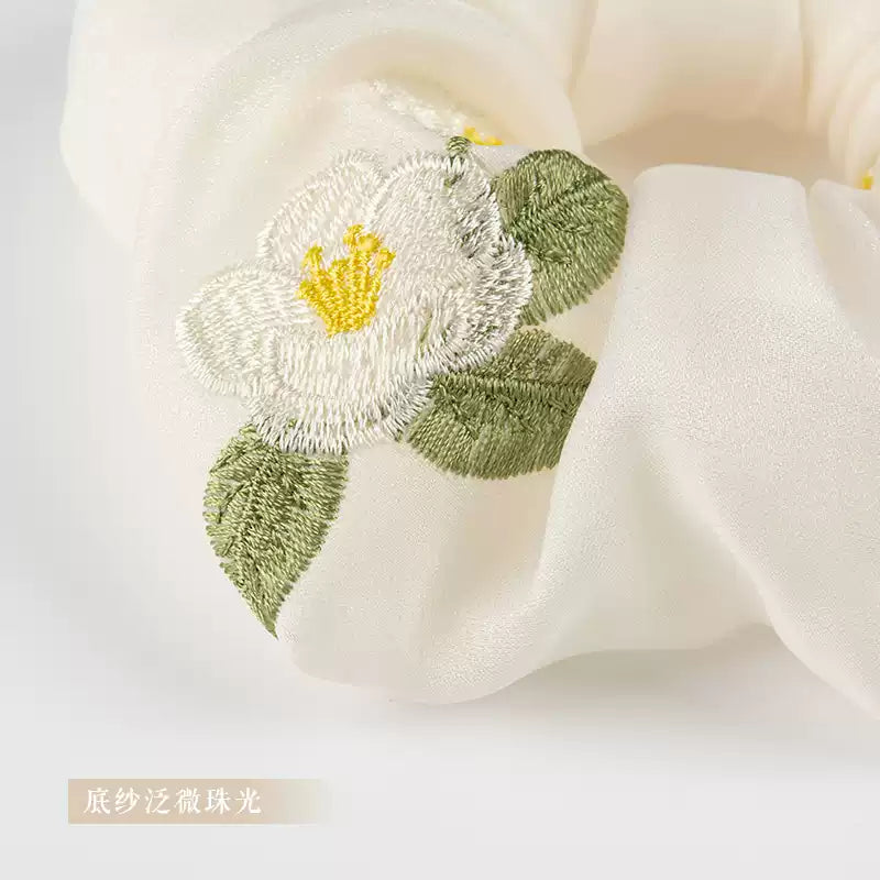 White Camellia Embroidered Hair Tie with Gentle Sweet Niche Original Design Style