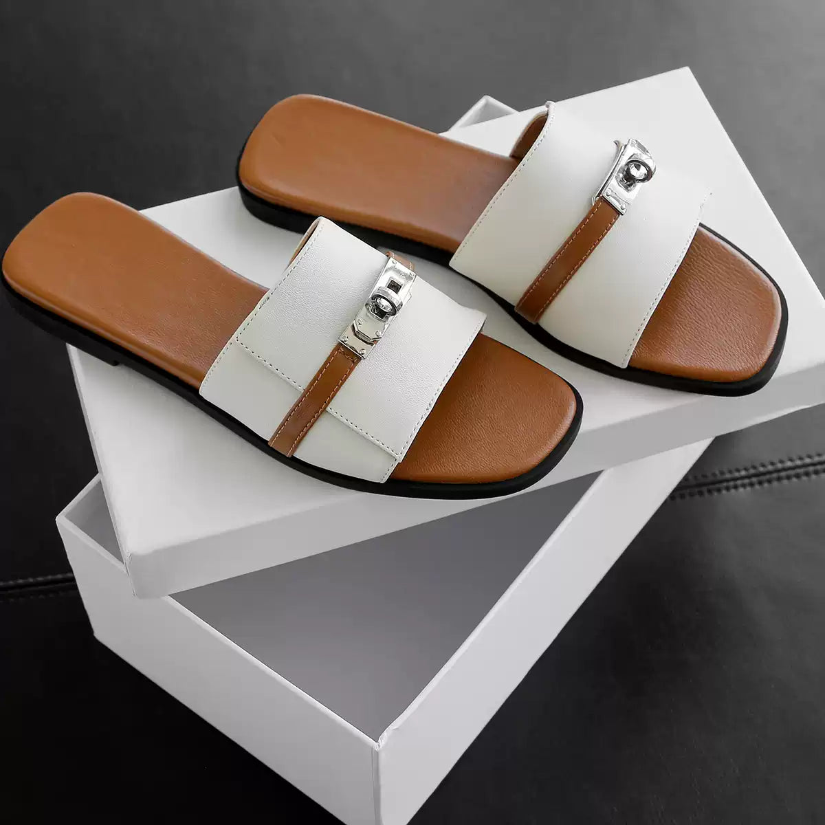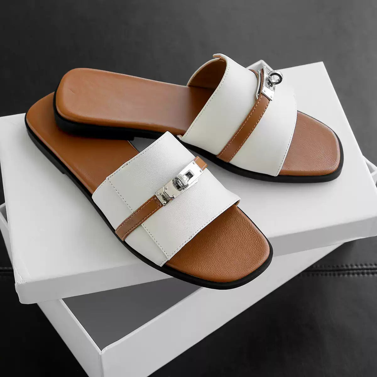 White Summer Square-toe Flat Leather Sandals Slipper Shoes with a Buckle Strap for Women